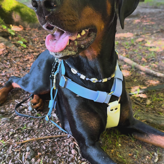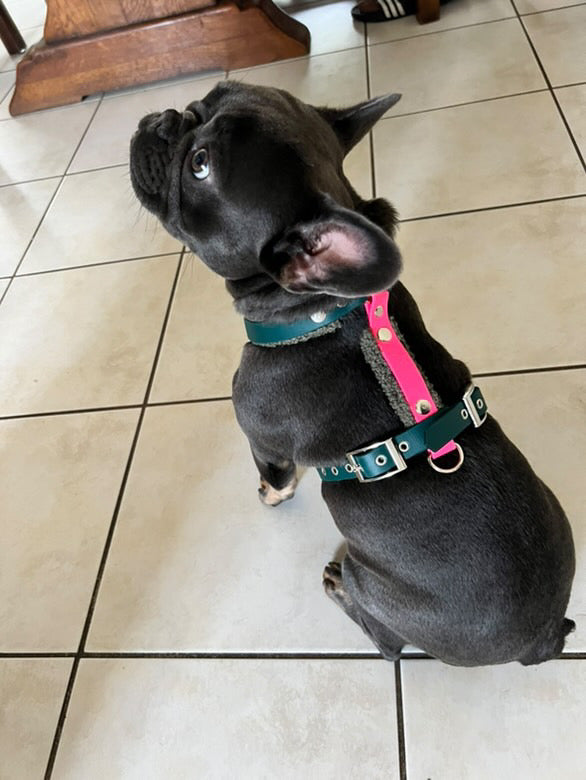 Entrez les mesures de votre toutou comme sur le guide des mesures (voir photo 2 et 3), choisissez la largeur du Harnais (19/25mm, 25/38mm ou 38/50mm)
