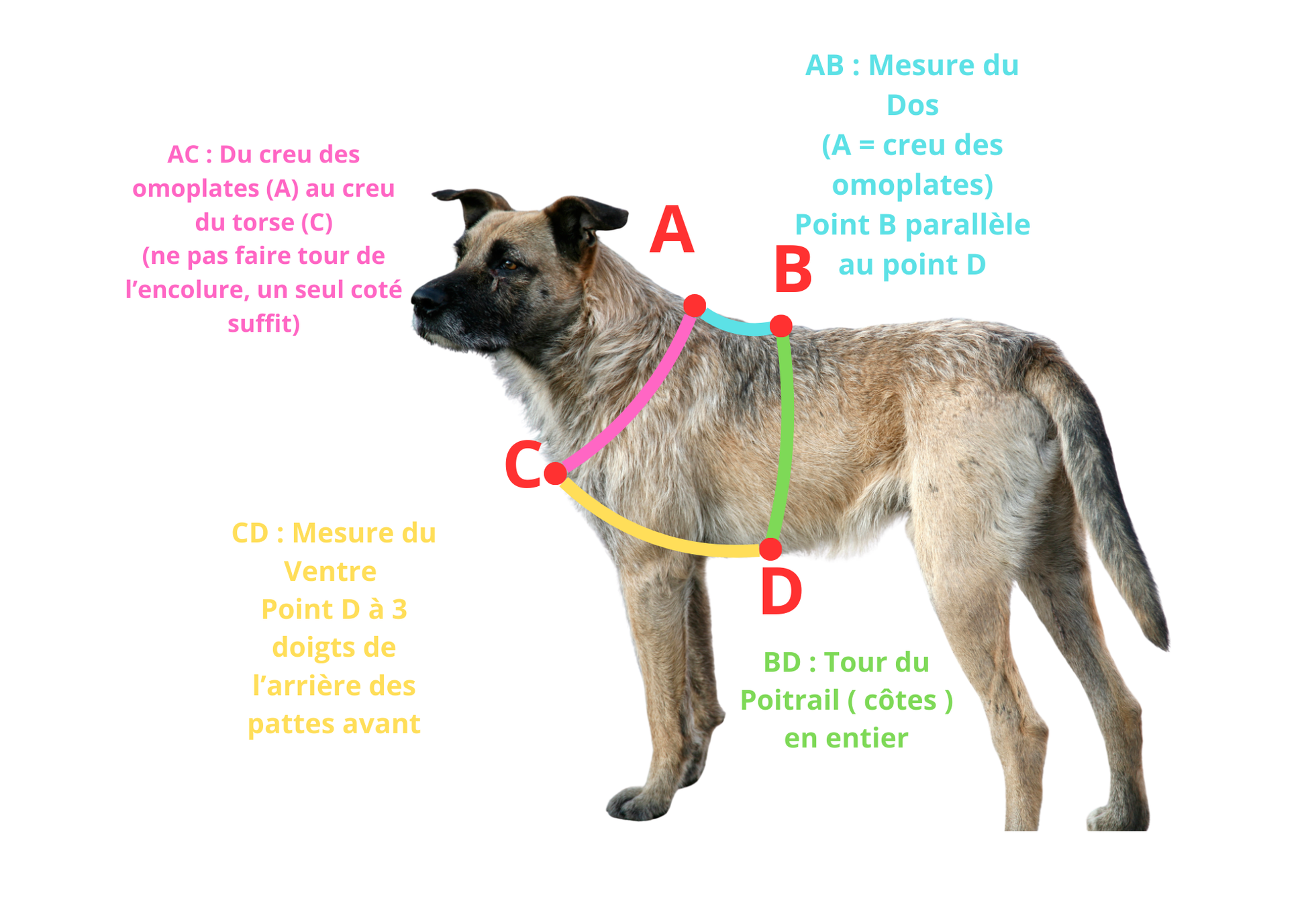La mesure du dos (Mesure A) et celle du ventre (Mesure D) sont faites sur mesure pour convenir au mieux à la morphologie de votre chien.